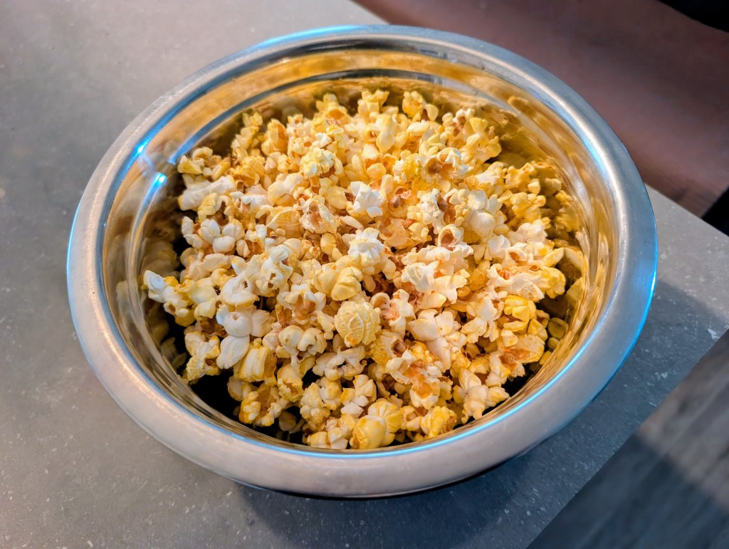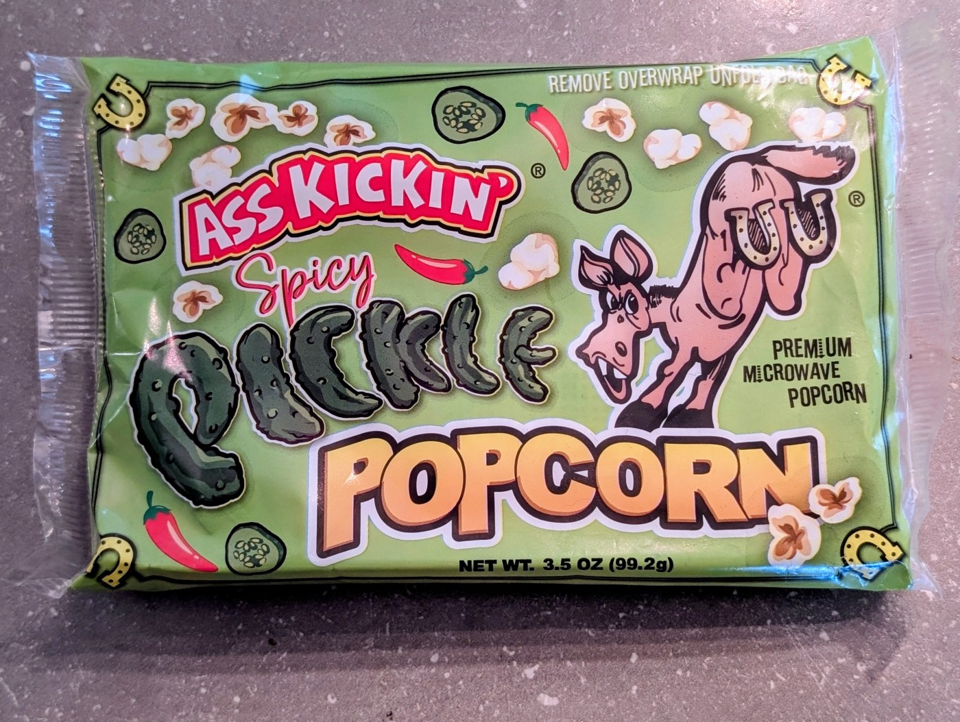 Hier, mon conjoint est arrivé tard, mais avec une surprise : du popcorn au pickle, très bon, mais spicy. Ça sent le cornichon partout dans la maison. 🙂 J’avais goûté une autre sorte de la même marque dont j’ai oublié le nom ; elle était fameuse, dommage qu’il n’en avait plus.