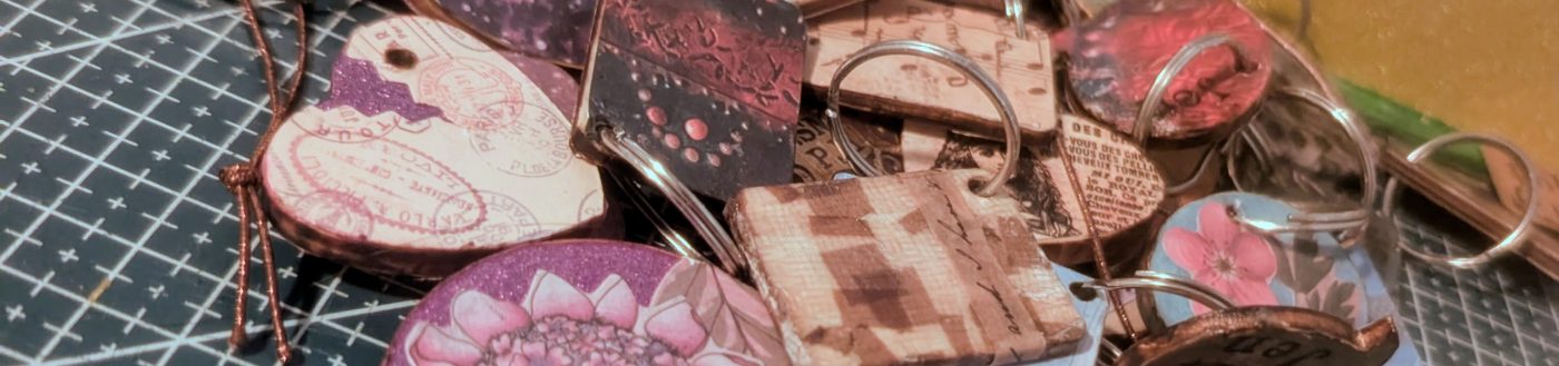 Des porte-clés ou des médaillons. La fabrique s’est fait aller pendant mon silence. Je devais me vider l’esprit et occuper mon angoisse d’être loins de mes enfants. Pour ceux qui se demande la façon de faire ces petits trucs. Ce n’est qu’un montage « modpodge » papier sur de petits modèles en bois. et brûlé sur les côté avec un pyrograveur. Le tout fait très vintage 🙂